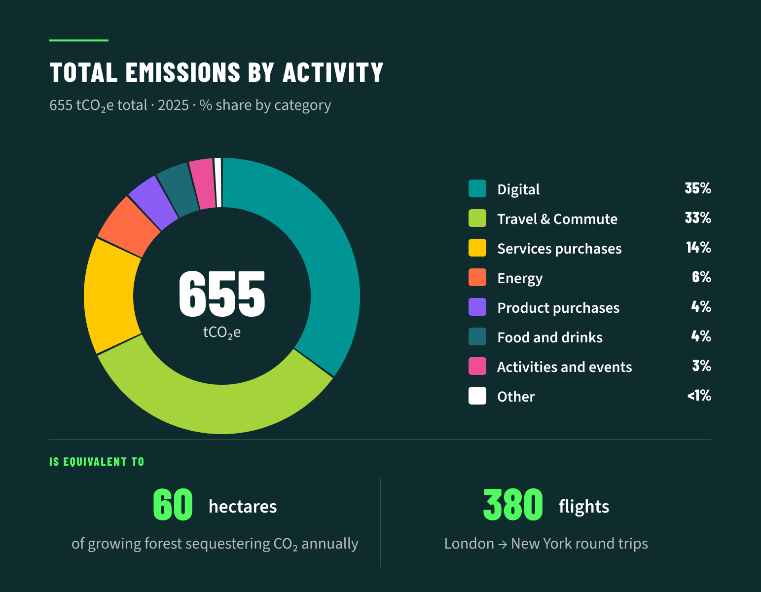 As in 2024, 99% of our emissions are Scope 3 — indirect emissions from our supply chain, purchased services, and digital infrastructure. Scope 1 (direct emissions, <0.1 tCO₂e) and Scope 2 (electricity, 3.9 tCO₂e) together account for less than 1% of our footprint.