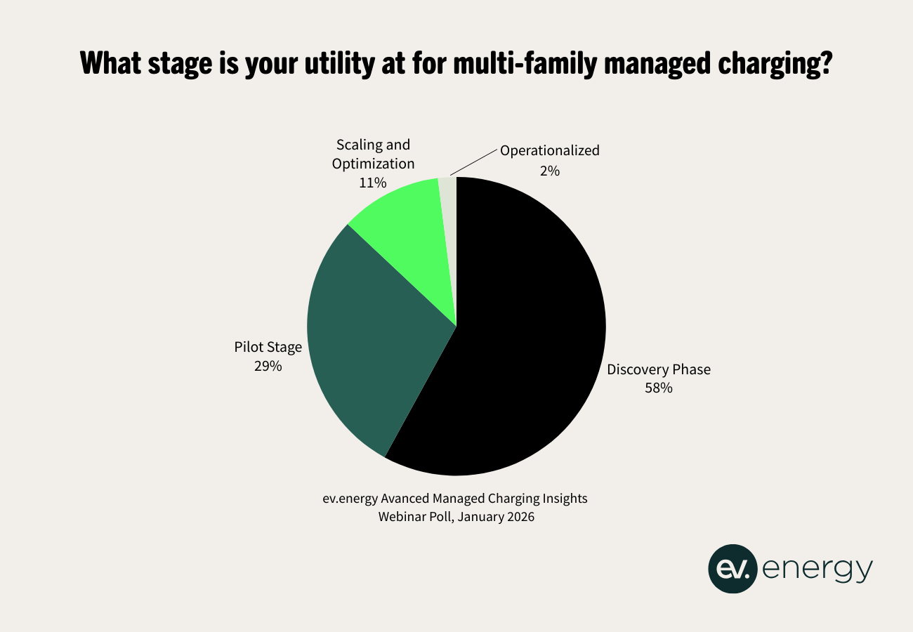 POLL: What stage is your utility at for multi-family managed charging? Discovery Phase: 58%. Pilot Stage: 29%, Scaling & Optimization: 11%, Operationalized: 2%.