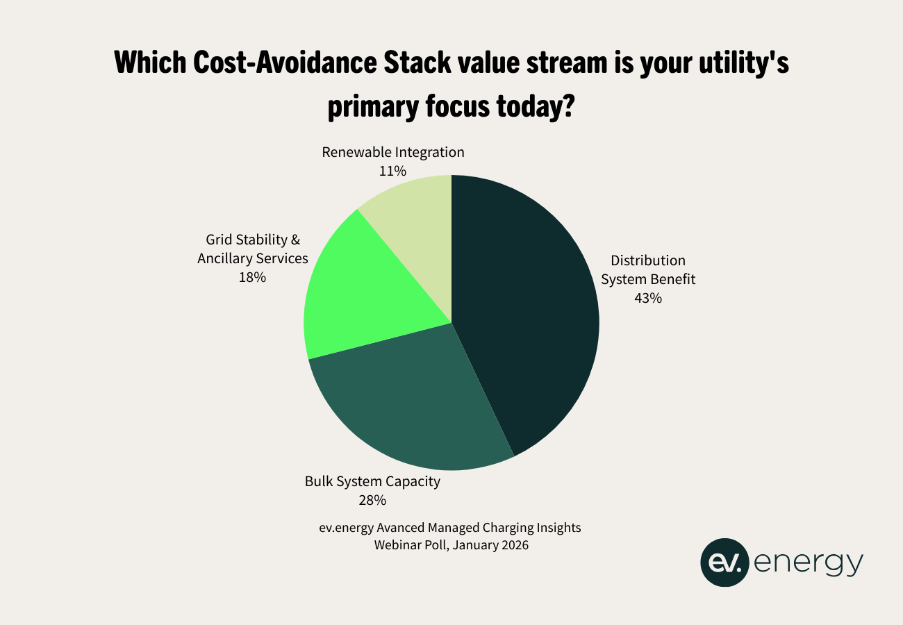 POLL: What is your primary focus for EV-related cost avoidance? Distribution System Benefit: 43%, Resource Adequacy: 28%, Grid Stability & Ancillary Services: 18%, Renewable Integration: 11%.