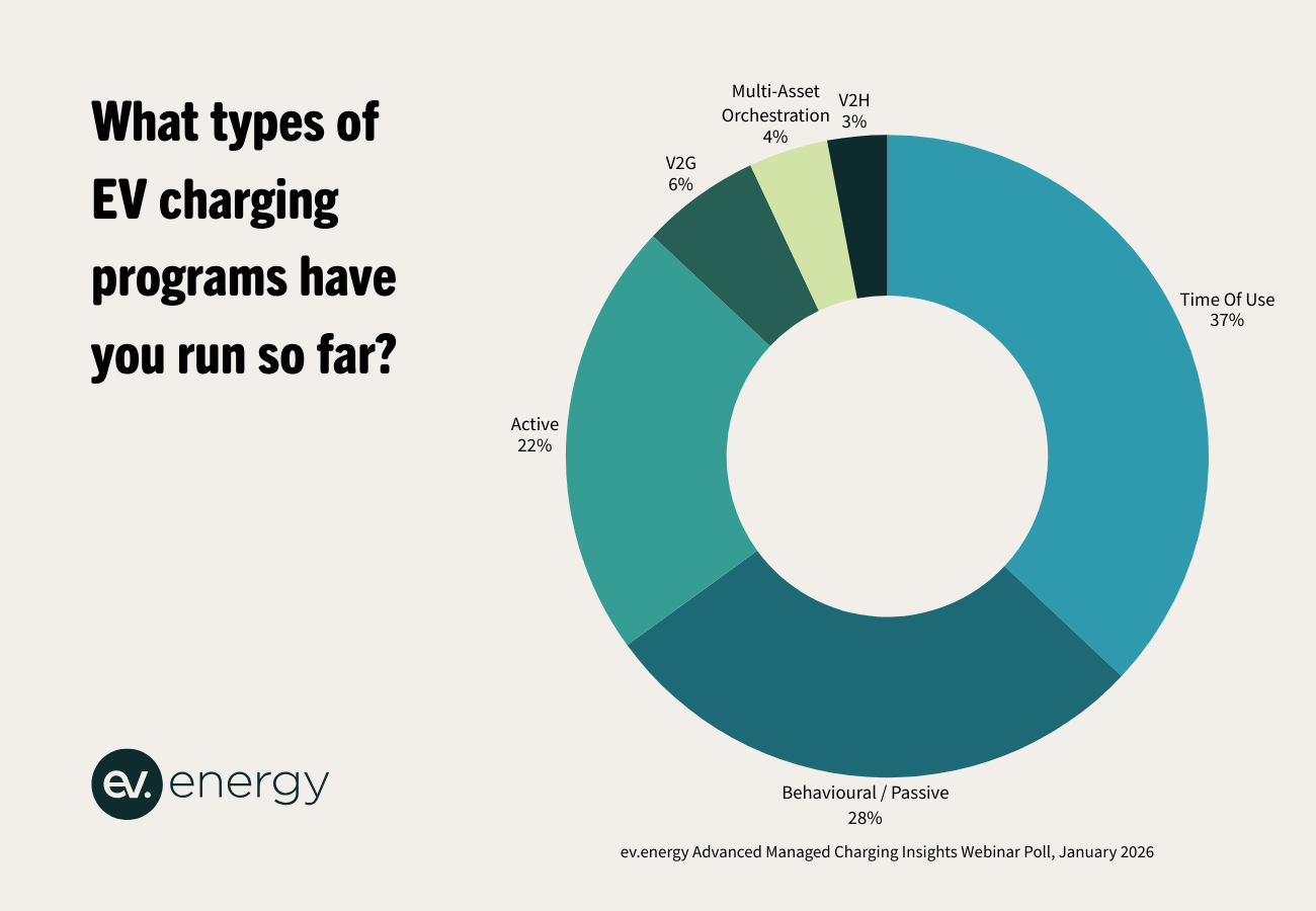 POLL: What types of EV charging programs have you run so far? Time Of Use: 37%, Behavioural / Passive: 28%, Active: 22%, V2G (Vehicle-to-Grid): 6%, Multi-Asset Orchestration: 4%, V2H (Vehicle-To-Home): 3%.